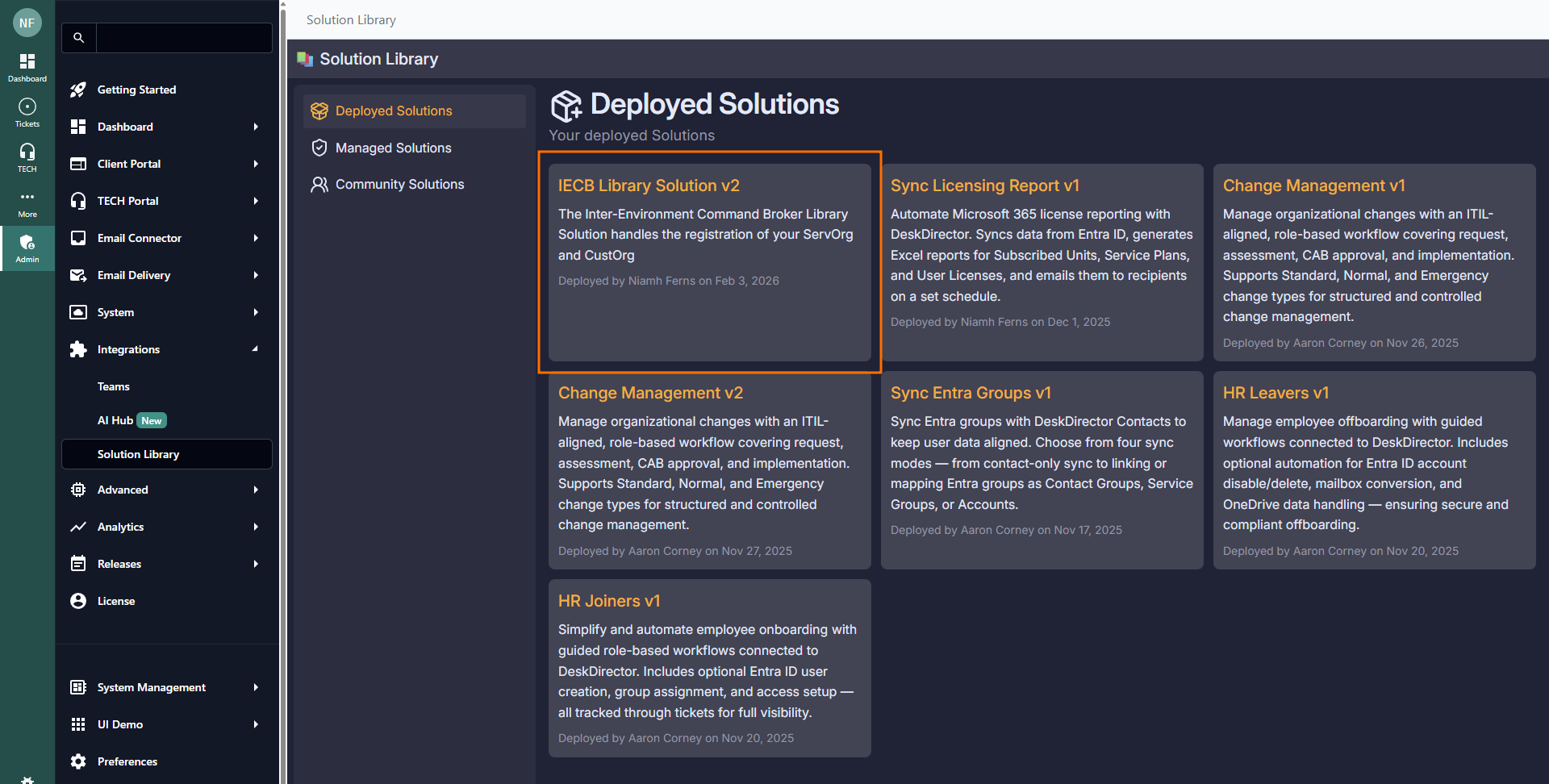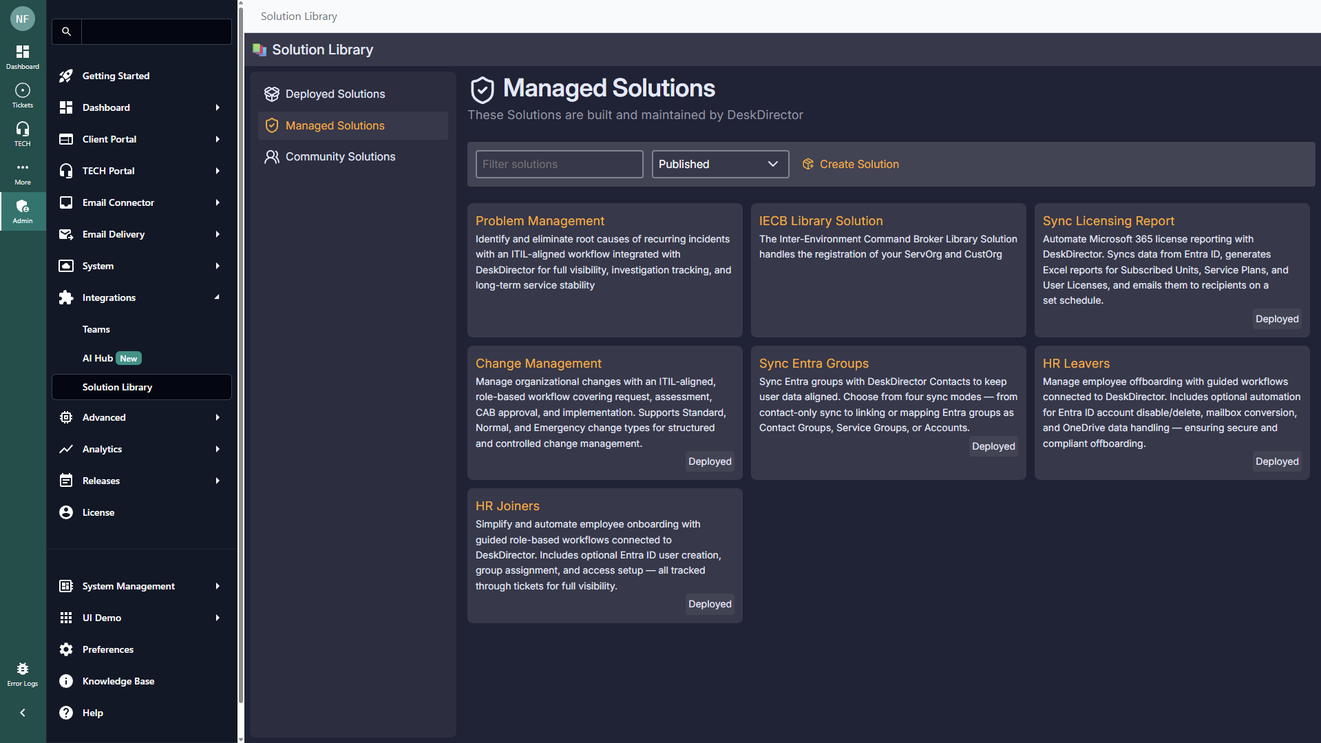 To deploy a solution, simply head to Integrations > Solution Library in your DeskDirector Admin Portal and then: