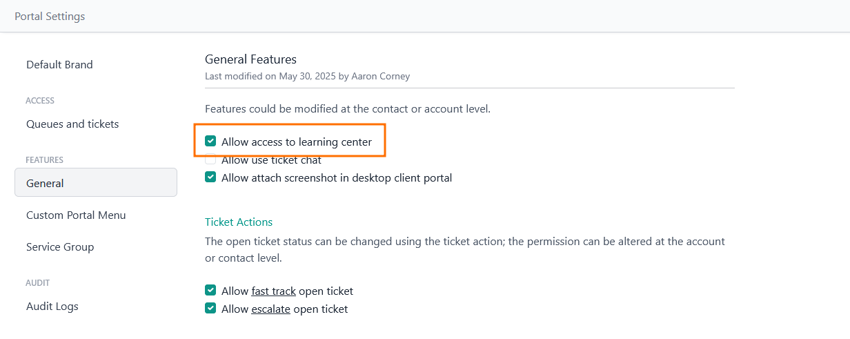 To set up the Learning Center, head over to your Admin Console under Client Portal > Global Settings. On this page, under the General tab, simply select Allow access to learning center to let your clients access this globally: