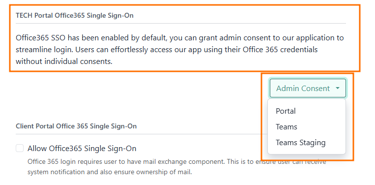 System>Authentication>TECH Portal Office365 Single Sign-On(For TECH Portal users only.) - Select the drop-down for "Admin Consent" and select "Portal" (for Tech Portal users)